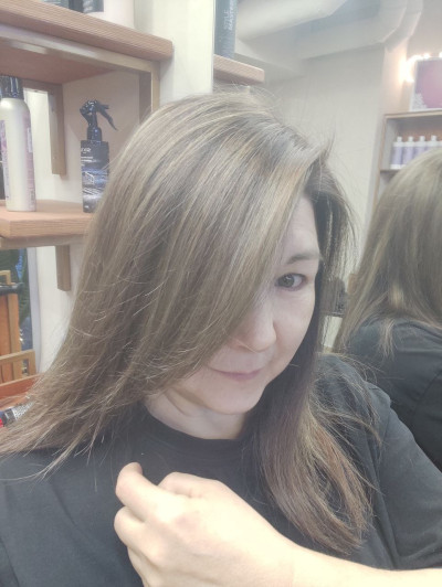 - Hair: Dark brown, Medium length
