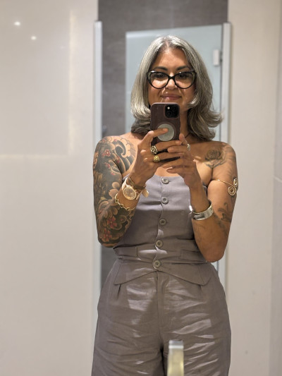 • Hair: Grey, Medium length